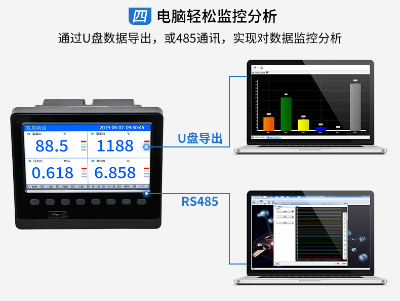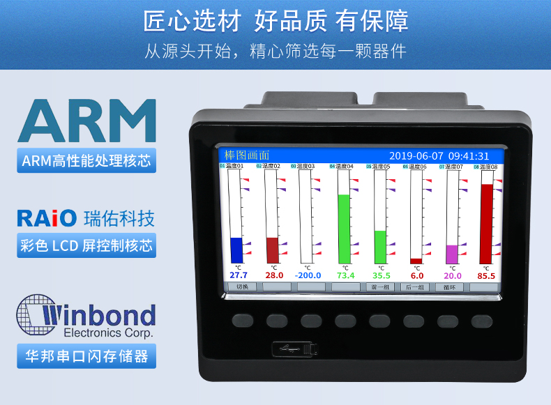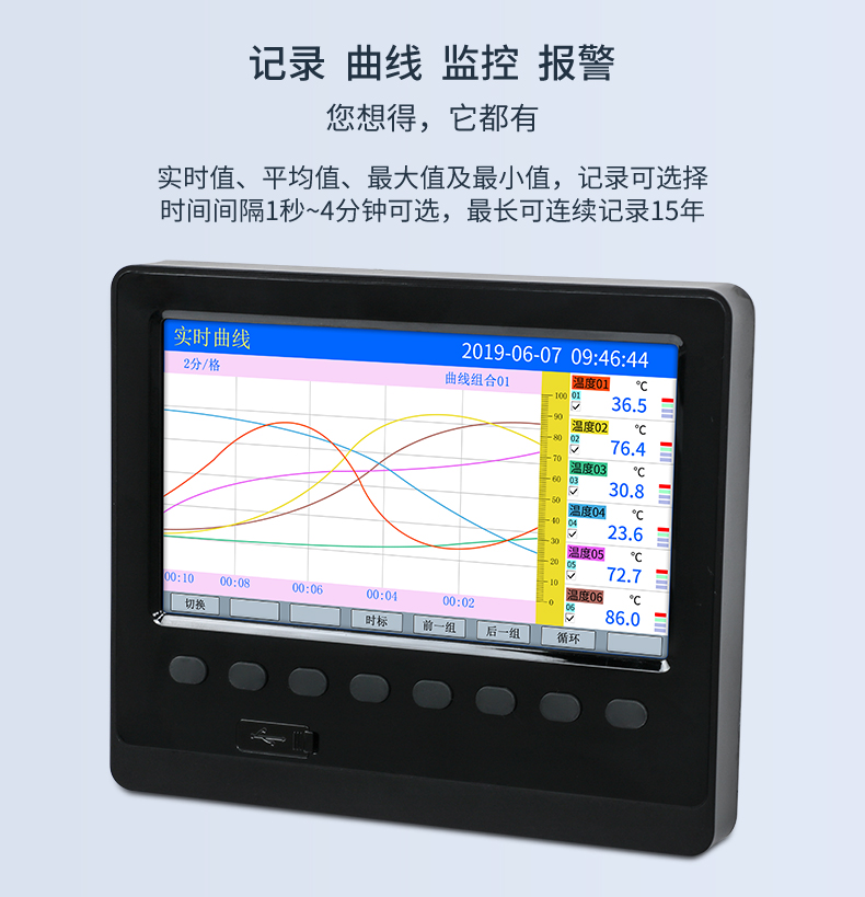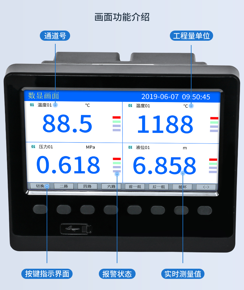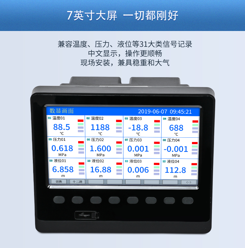 SIN-R5000C無紙記錄儀 12 路萬能輸入(可組態選擇輸入:標準電壓、標準電流、熱電偶、熱電阻、毫伏等)。可帶 12 路報警輸出或 6 路模擬量變送輸出,RS485 通訊接口,以太網接口,微型打印機接口和 USB 接口,SD 卡插座;可提供傳感器配電;具有強大的顯示功能,實時曲線顯示,歷史曲線追憶,棒圖顯示,報警列表顯示等。人性化的外觀設計、完美的功能體現、可靠的硬件品質、精湛的制造工藝,使儀表具有更高的性能價格比。