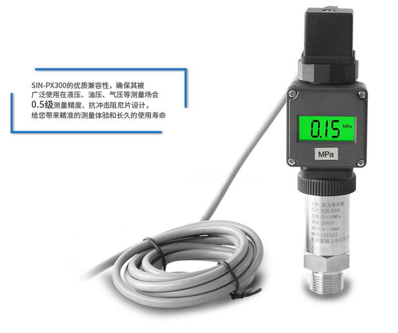 SIN-PX300型數顯壓力變送器采用無縫焊接結構,可批量化生產,經濟、可靠,具有良好的適應性,可應用于各種復雜的環境,該產品輸出形式多樣,壓力接口可提供定制,滿足您的使用需求。同時數顯壓力變送器帶有現場顯示功能,能夠更加直觀的顯示現場的壓力波動情況。廣泛應用于工業自動化設備配套以及石油、化工、冶金、電力等控制領域。