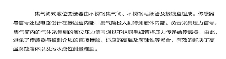 集氣桶式液位變送器(下稱變送器)用于測量較高溫度液體介質的液位,原理是被測液體介質壓縮集氣桶內的空氣,空氣壓力通過毛細管傳遞給敏感元件,敏感元件本身不與被測介質直接接觸,因此變送器可以應用在較高溫度的介質環境中,同時,內置微型信號放大處理電路,可以直接與計算機接口卡、控制儀表、智能儀表或 PLC 等連接,進行遠程傳輸。變送器廣泛應用于環保、水利、供水、工業過程控制、變頻供水等較高溫度介質的液位測量。