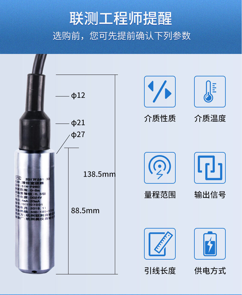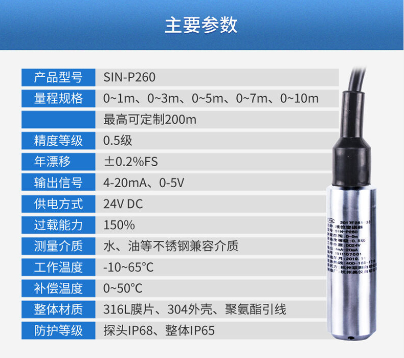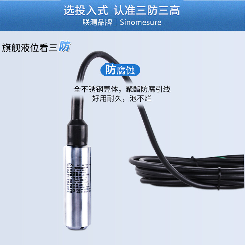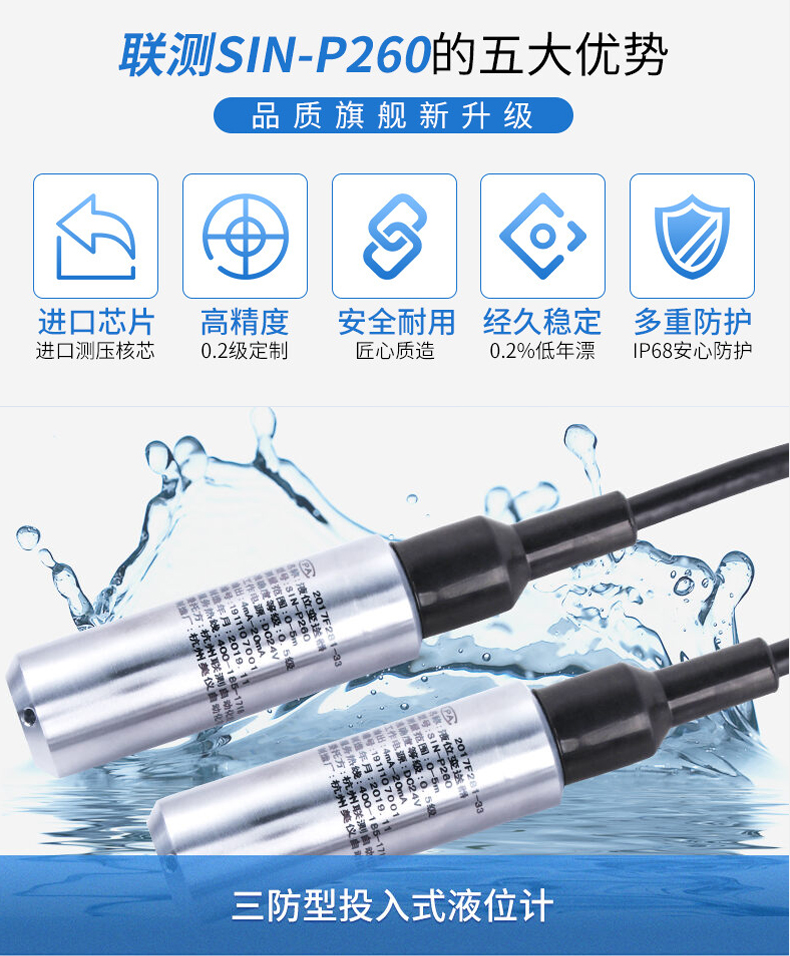 SIN-P260/P2600投入式液位變送器由高性能擴散硅壓阻式壓力傳感器作為測量元件,把與液位深度成正比的液體靜壓力準確測量出來,并經過信號調理電路轉換成標準(電流或電壓)信號輸出,建立起輸出信號與液體深度的線性對應關系,實現對液體深度的測量。